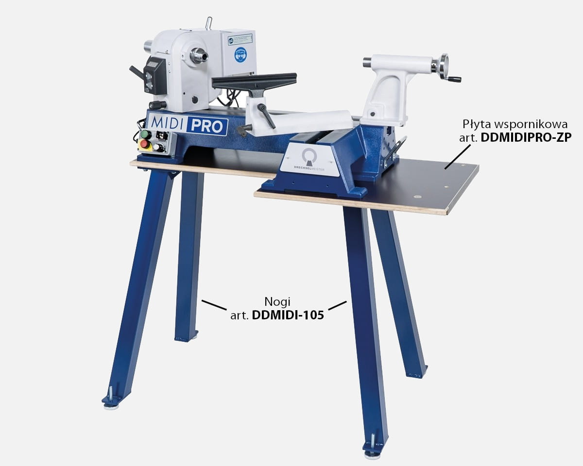 - nóg o konstrukcji stalowej (art. DDMIDI-105); mogą być wypełnione ok. 13 kg piasku dla zwiększenia ciężaru. Na wyposażeniu ze stopkami regulacyjnymi. Wysokość - 78 cm, waga - 15 kg. Nogi mogą być przymocowane bezpośrednio do tokarki lub do płyty wspornikowej