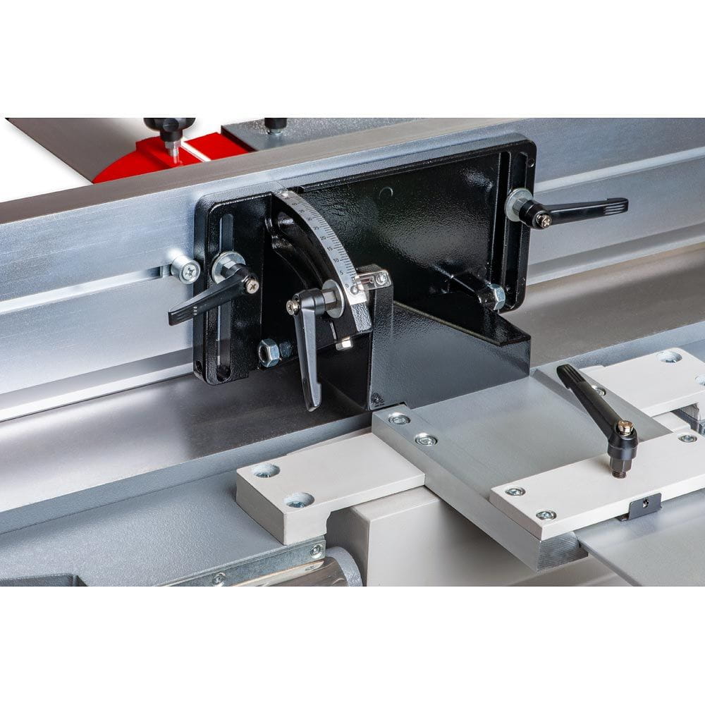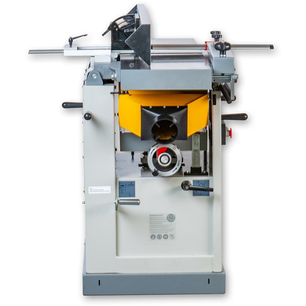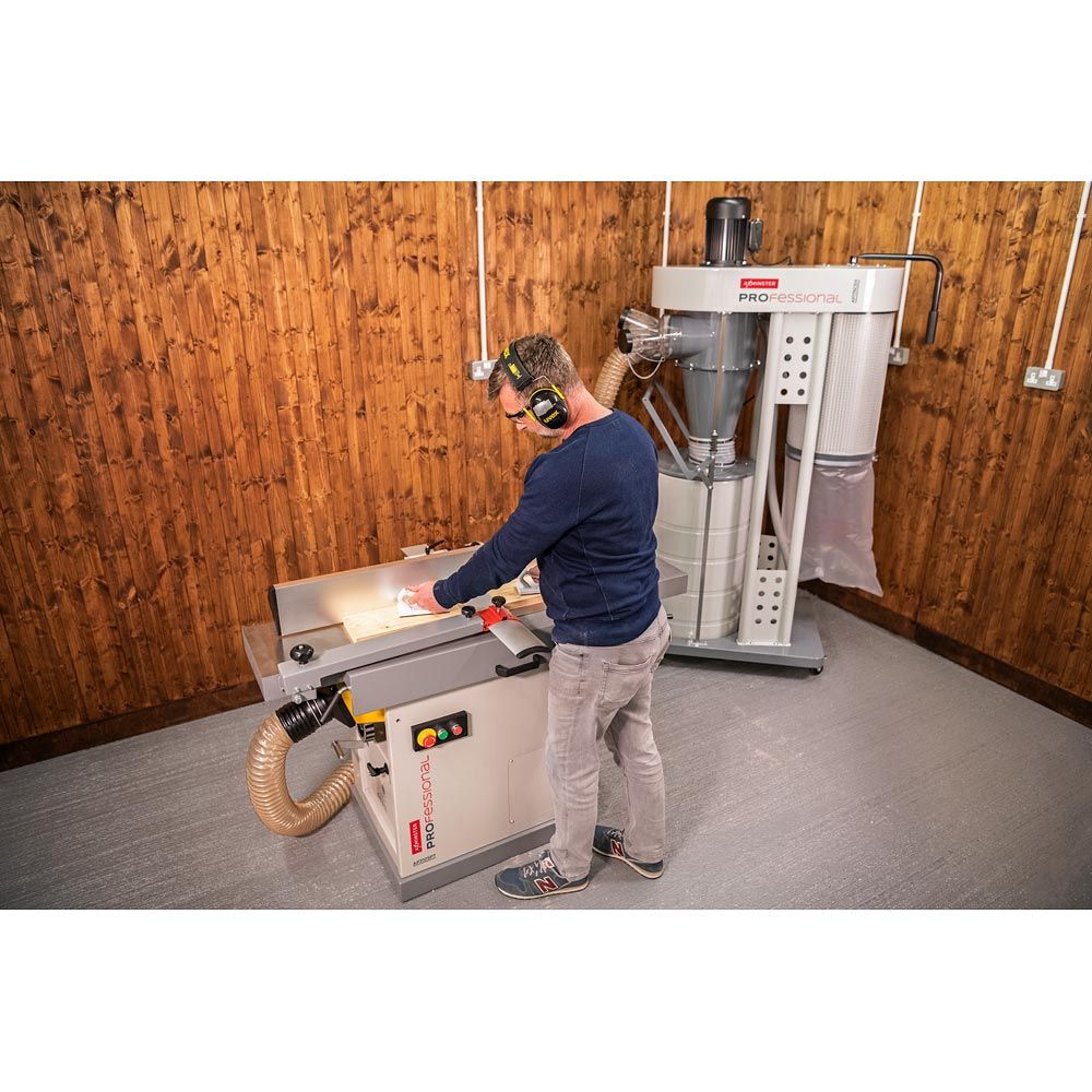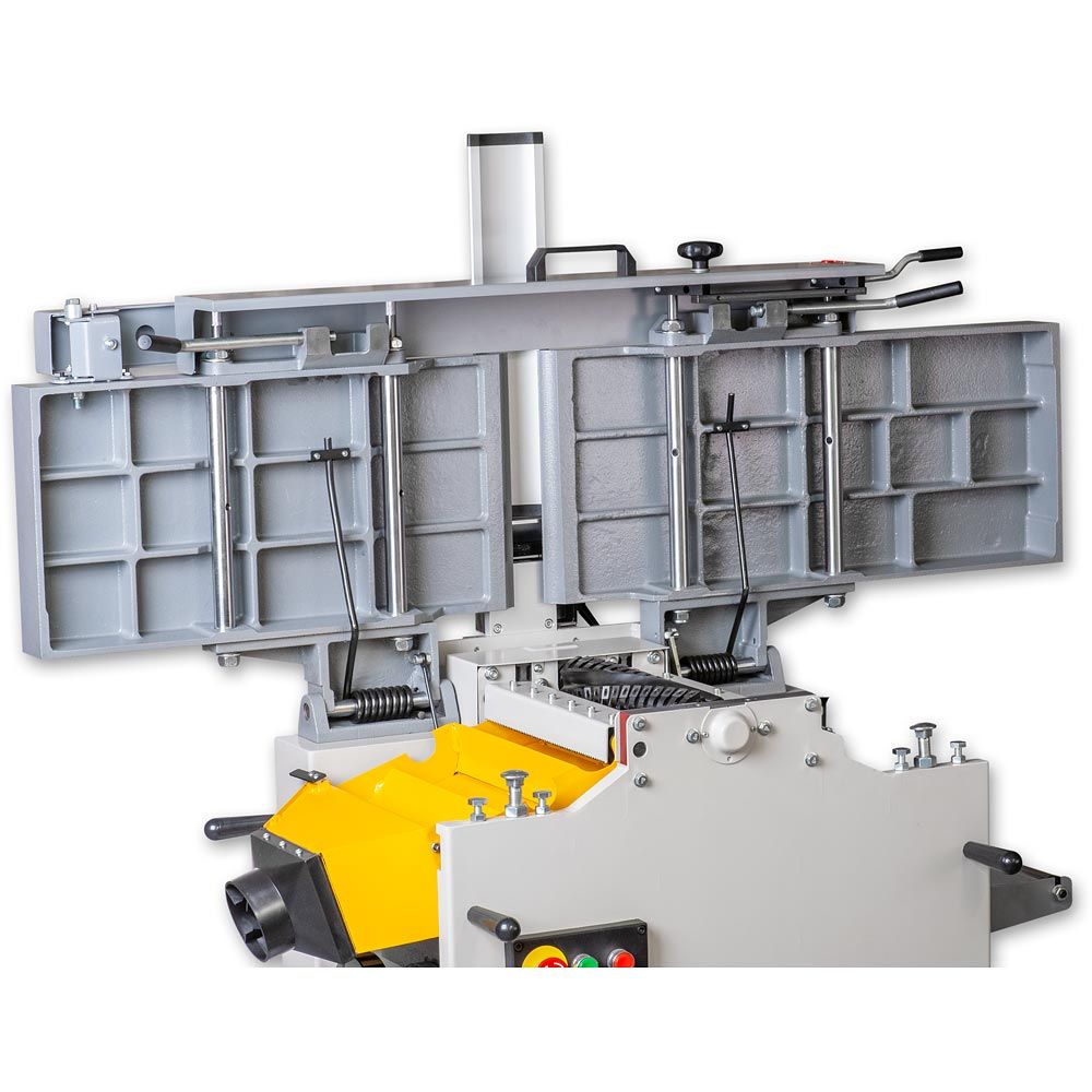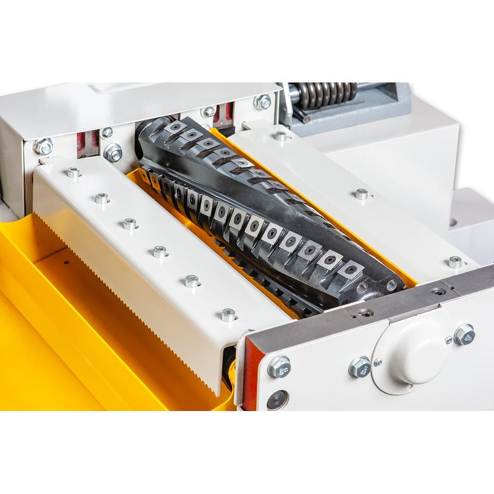 Strugarko-grubościówka AP310SPT marki Axminster została zaprojektowana i zbudowana do intensywnej, codziennej pracy w profesjonalnym warsztacie stolarskim. Aby zapobiec powstawaniu podcięć, długie żeliwne stoły są w pełni regulowane względem wału nożowego. Długa, sztywna prowadnica aluminiowa z ogranicznikami ustawionymi na 90° i 45° zapewnia podparcie obrabianego elementu. Z tyłu maszyny znajduje się uchwyt do przechowywania prowadnicy, gdy nie jest używana. Stoły są uchylne niezależnie i blokowane w pozycji roboczej do pracy w trybie grubościówki. Stół grubościówki porusza się płynnie, a cyfrowy wskaźnik wysokości umożliwia dokładne ustawienie głębokości skrawania. Odciąganie wiórów odbywa się przez uchylną, obrotową osłonę, wyposażoną dla bezpieczeństwa w blokadę elektryczną. Posuw mechaniczny o prędkości 5 m/min gwarantuje równą i gładką powierzchnię.