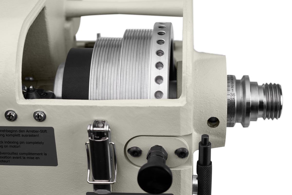 Wrzeciennik tokarki jest obracany i przesuwany wzdłuż łoża, co umożliwia szybkie znalezienie optymalnej pozycji roboczej. Rozwiązanie to pozwala również na zastosowanie opcjonalnego wysięgnika do toczenia poza łożem, znacząco rozszerzając możliwości obróbki. Wrzeciennik wyposażono w zapadki w pozycjach 0–60–90–120–180–270°, a także w mechanizm precyzyjnego ustawienia w pozycji 0°, gwarantujący dokładne wyosiowanie obu centrów. Maksymalna długość toczenia wynosi imponujące 1100 mm.