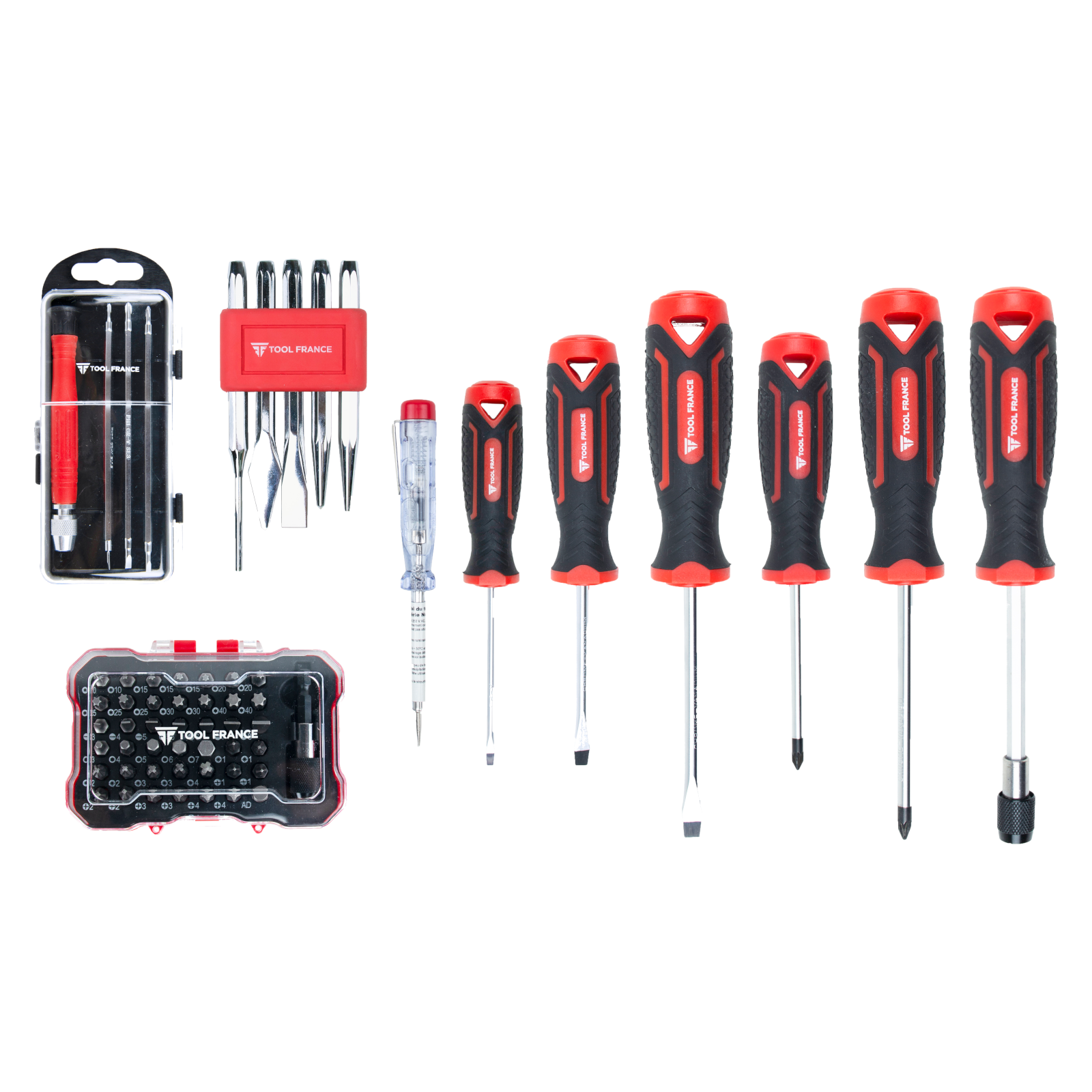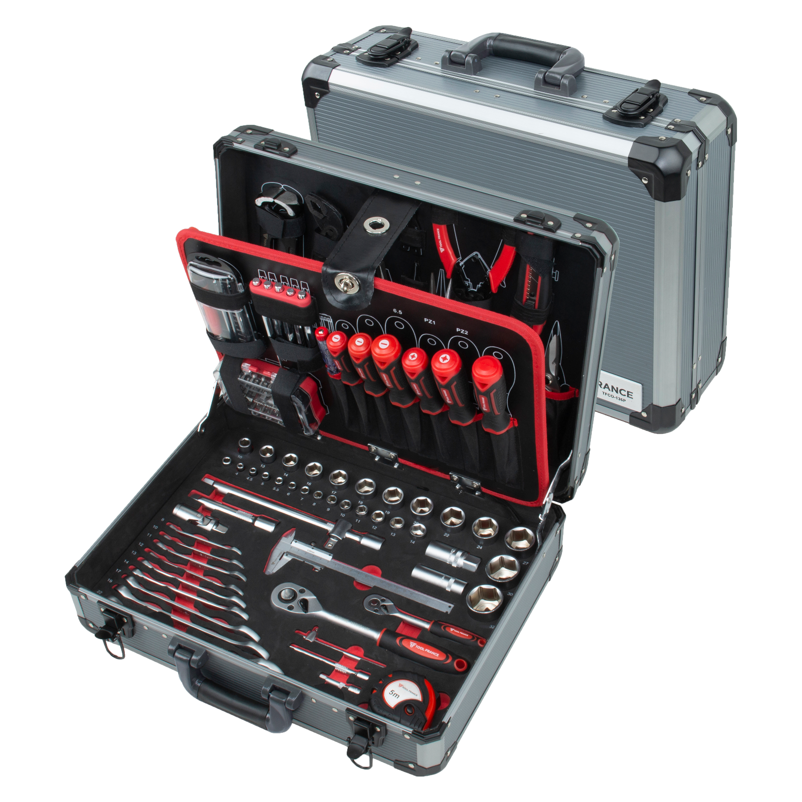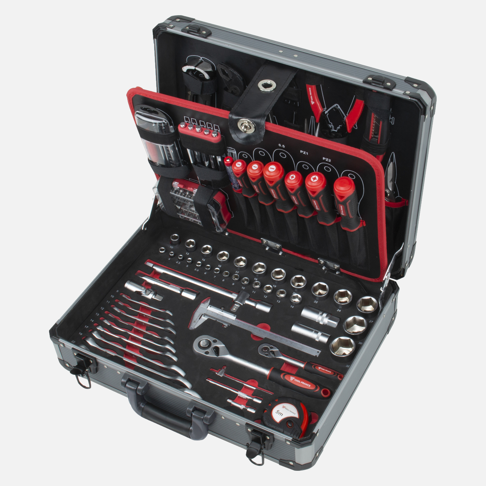 Bogato wyposażona walizka narzędziowa. Przyda się w domowym warsztacie, zakładzie, na montażu, działce lub budowie. Zawiera łącznie 136 narzędzi i akcesoriów umieszczonych w dolnej i górnej części walizki oraz po obu stronach oddzielającej je przekładki. Części umieszczone w dolnej części mieszczą się w dwukolorowej, twardej piance. Reszta znajduje się w kieszeniach lub przytrzymywana jest opaskami na rzep.