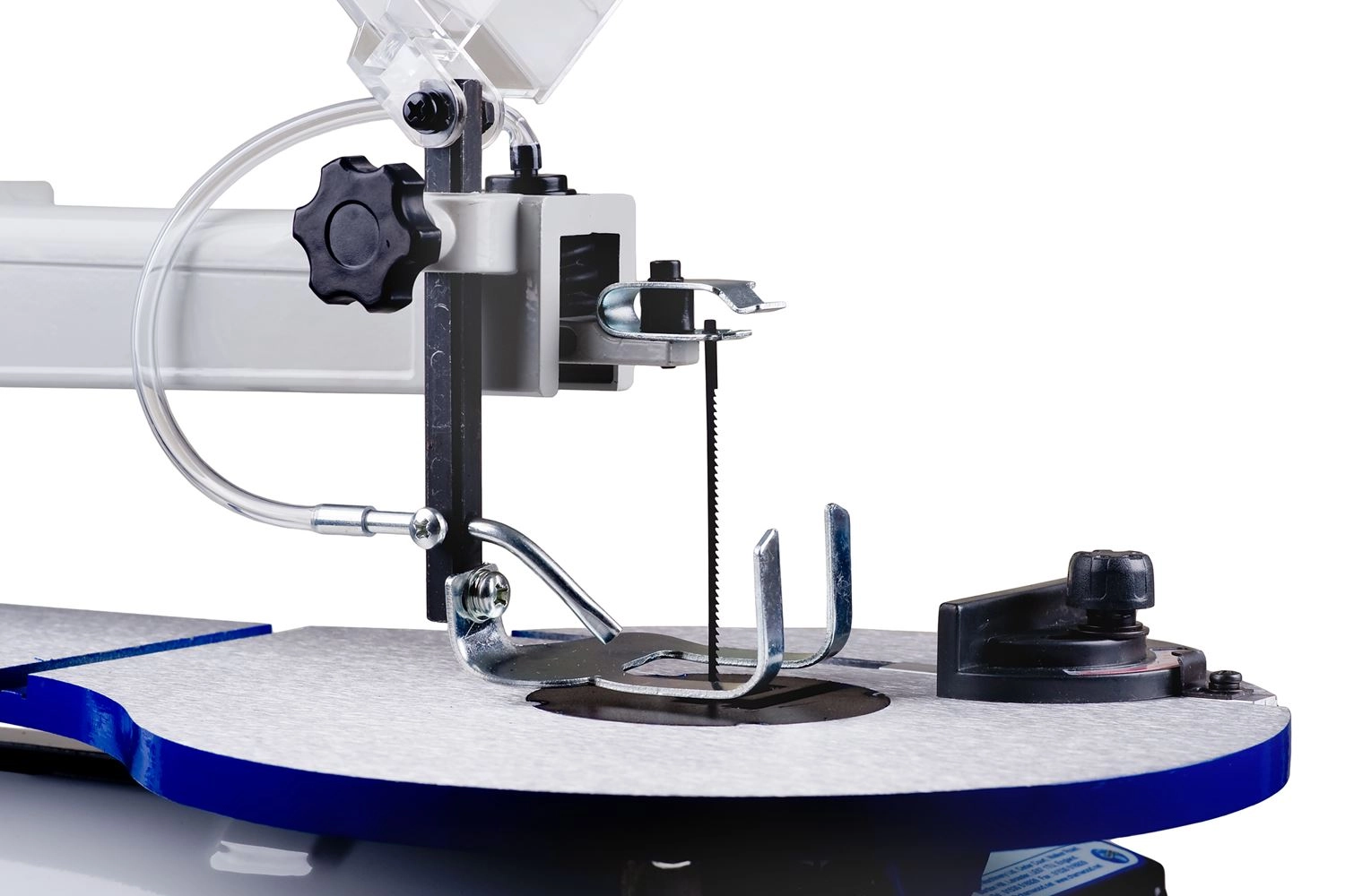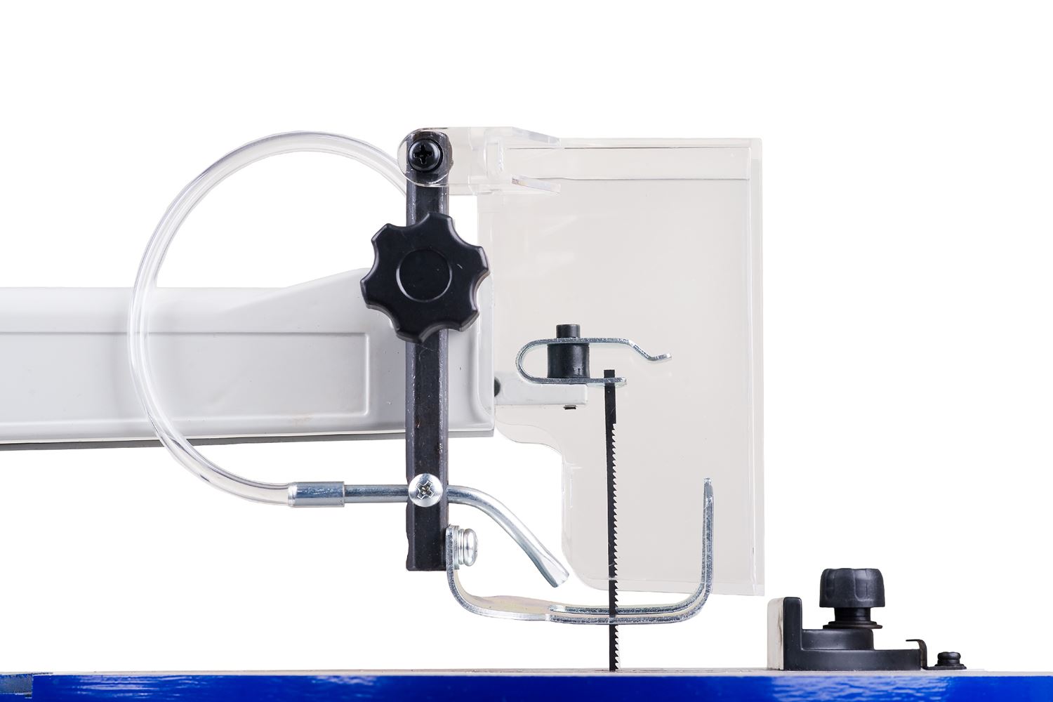 Wyrzynarka może ciąć różne materiały o wysokości do 50 mm. Zacisk o regulowanej wysokości przytrzymuje obrabiany przedmiot na stole i zapobiega drganiom. Z kolei dysza powietrza oczyszcza linię cięcia z pyłu. Przezroczysta osłona chroni użytkownika przed kontaktem z ruchomymi częściami i odłamkami z obrabianych elementów.