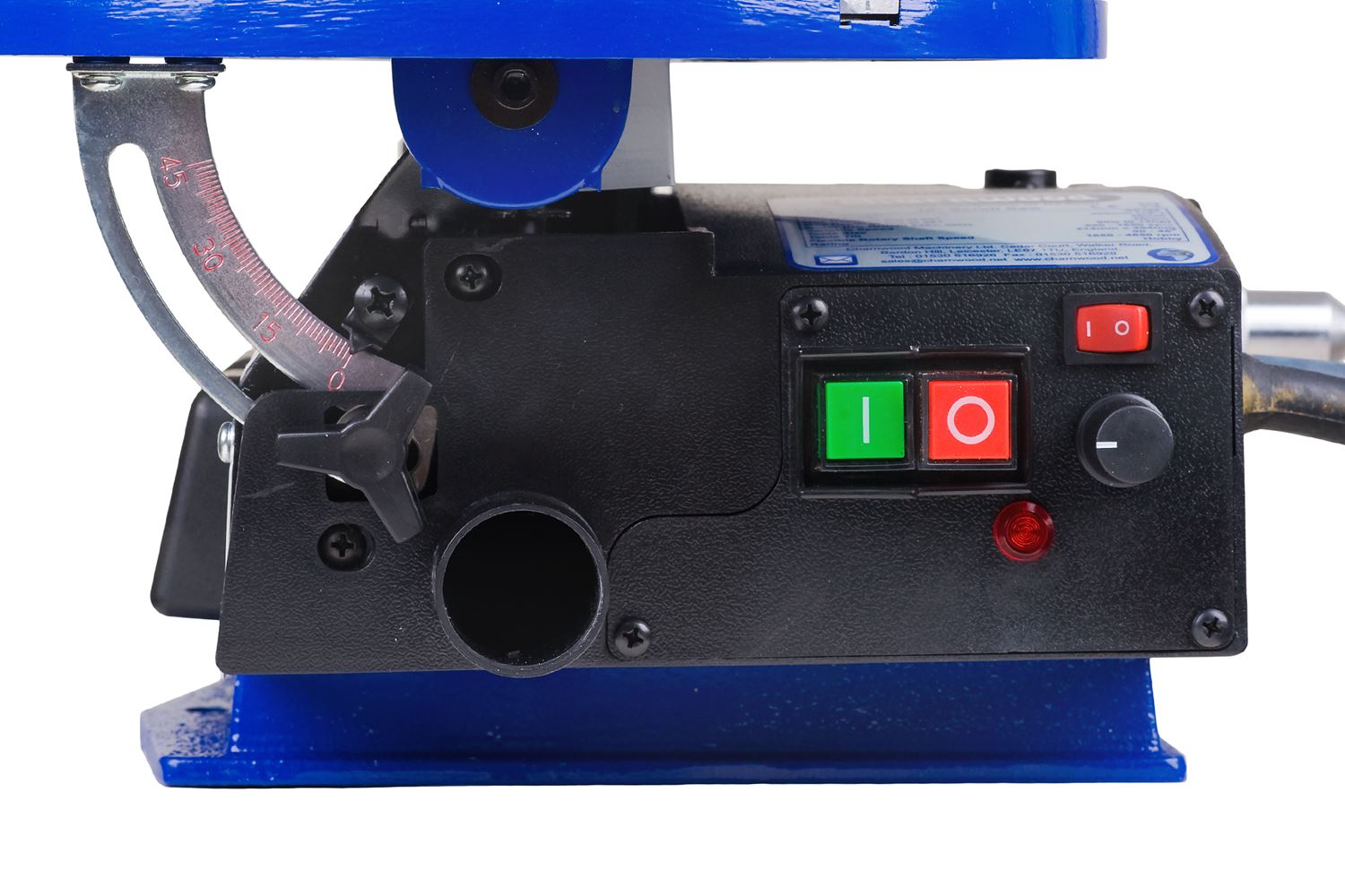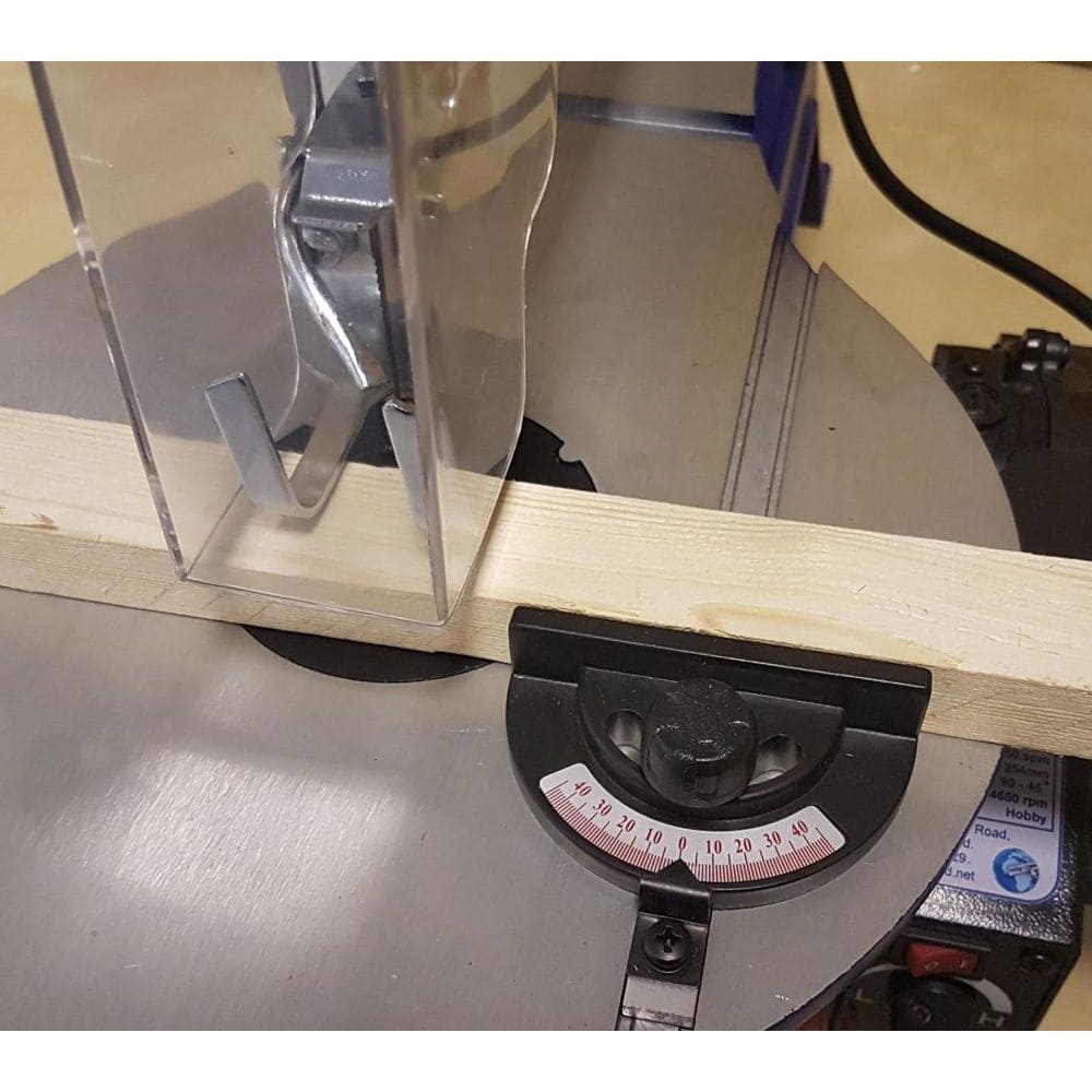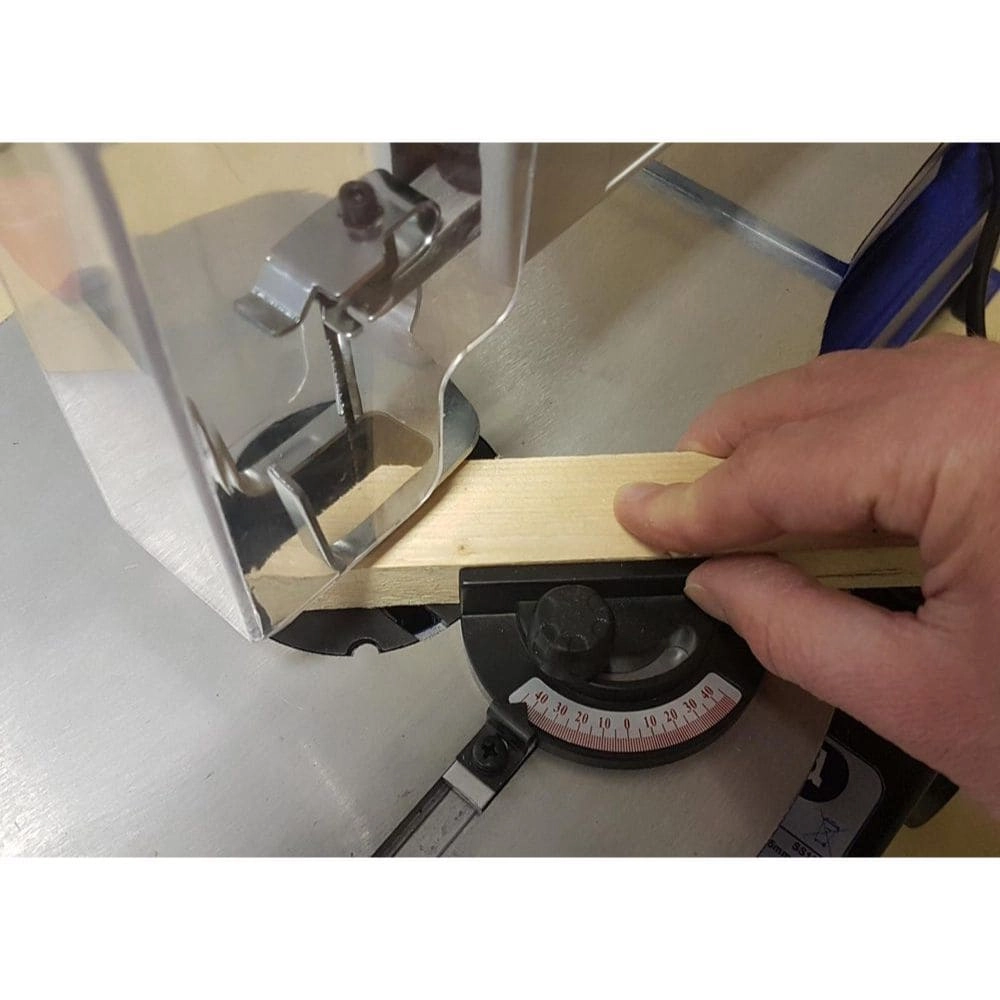 Aluminiowy stół roboczy posiada funkcję pochylania w zakresie od 0-45° oraz 2 sloty (szczeliny) służące do przesuwania w nich przykładnicy / ograniczniką kątowego, przydatnego podczas prostych cięć, a nie z wolnej ręki.