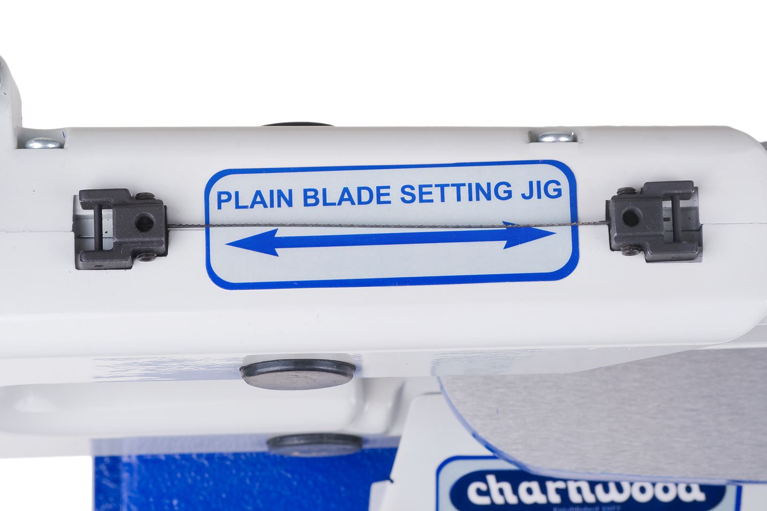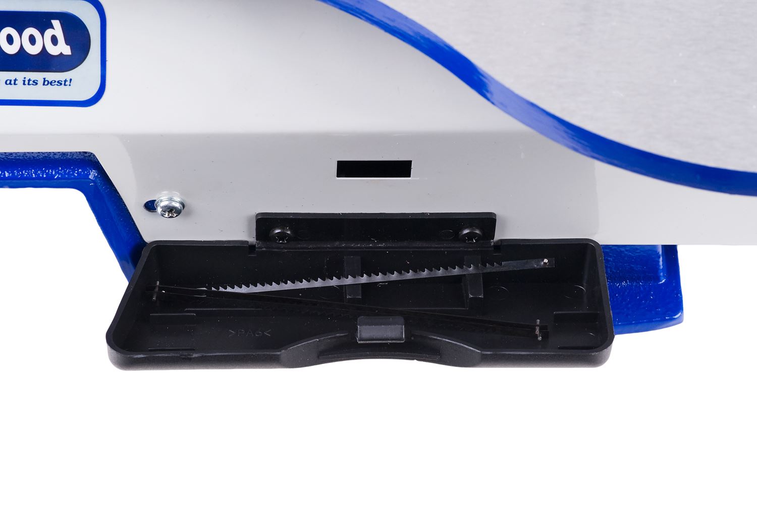 W wyrzynarce Charnwood SS16F można stosować zarówno brzeszczoty z zakończeniem płaskim, jak też z bolcami. Z boku znajduje się schowek na zapasowe brzeszczoty i drobne narzędzia.