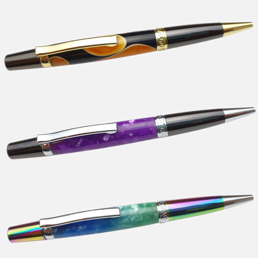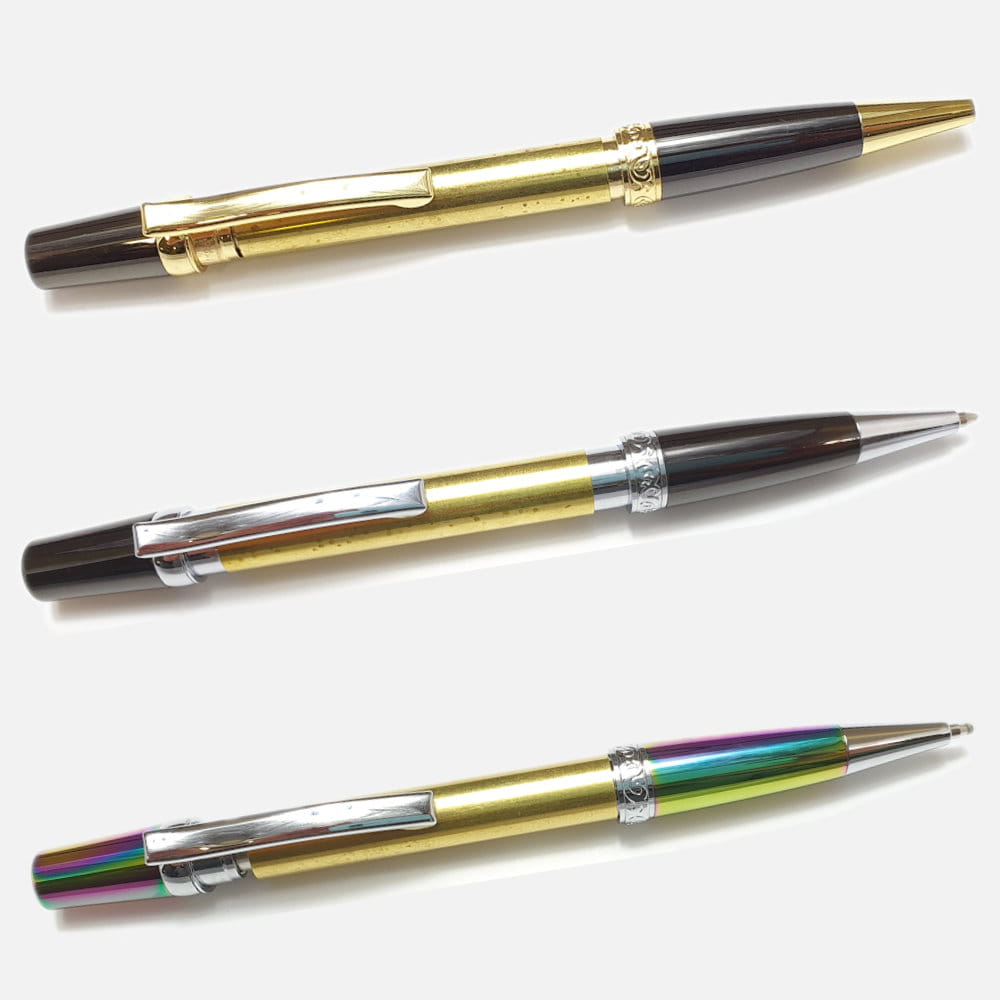 Bardzo stylowy, elegancki model długopisu z mechanizmem typu twist i starannie wykonanymi elementami. Wersja jednotubowa. Zestaw dostępny w wariancie złotym, chromowym i perłowym. Do wykonania można użyć blanków z różnych materiałów.
