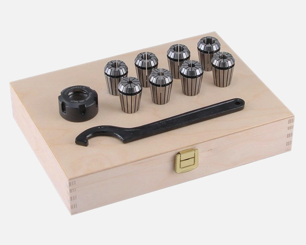 - drewnianą kasetkę do przechowywania (znajduje się w niej także miejsce na uchwyt MK2 na tulejki ER25 oraz na 4 dodatkowe tulejki)